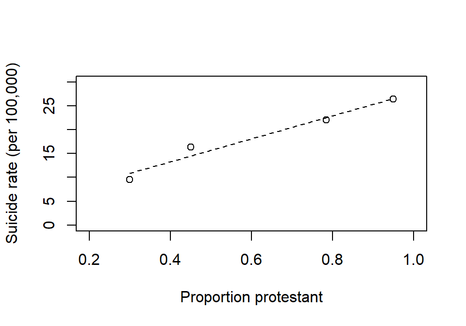 7H1. The figure below is data from a classical study on suicide rate and religious affiliation (data from 1880-1890). Suicide rate seem to increase with the proportion of protestants in four provinces (each data point refer to one province). The conclusion was that their religion make Protestants more likely to commit suicide than non-Protestants (primarily Catholics in this data). Find an alternative explanation.