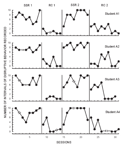 This is data from an educational experiment involving measurement of four children’s disruptive behaviors in class (y-axis) over time (x-axis), while alternating between conditions A (SSR) and B (RC), in a ABAB-design. Details are not important, but it is clear that method B led to a decrease in disruptive behaviors compared to method A for all four children (each row refer to data from one child). For details, see Lambert et al. (2006).
