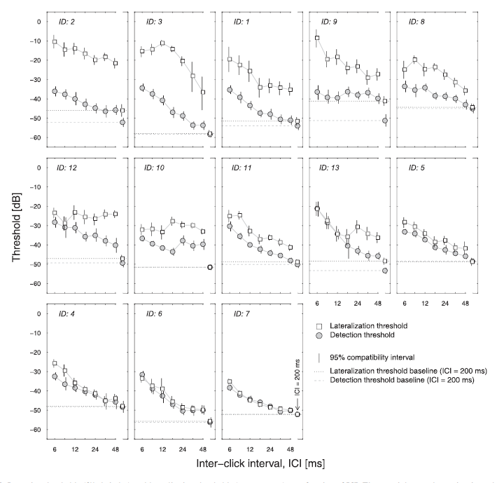 This is data from a psychoacoustic experiment involving 13 listeners. The details are less important, but focus on comparing thresholds (y-axis, low values are better) for the tasks involving detection of sounds (filled circles) versus localization of sounds (open squares). Some listeners had similar localization as detection thresholds (e.g., IDs 4, 6, and, 7), suggesting that if they could detect the sound they could also localize it. For others, this was not the case, most notably for the listeners in the upper row of panels. For details, see Tirado et al. (2021).