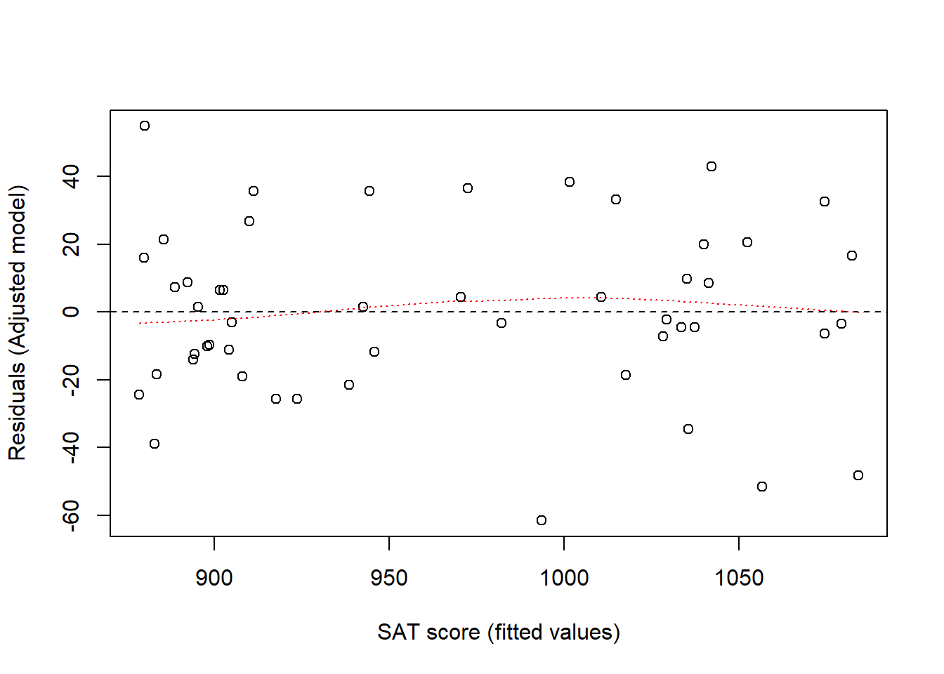 adjusted = glm(sat ~ expend + psatlog, data = d) # multiple regression model