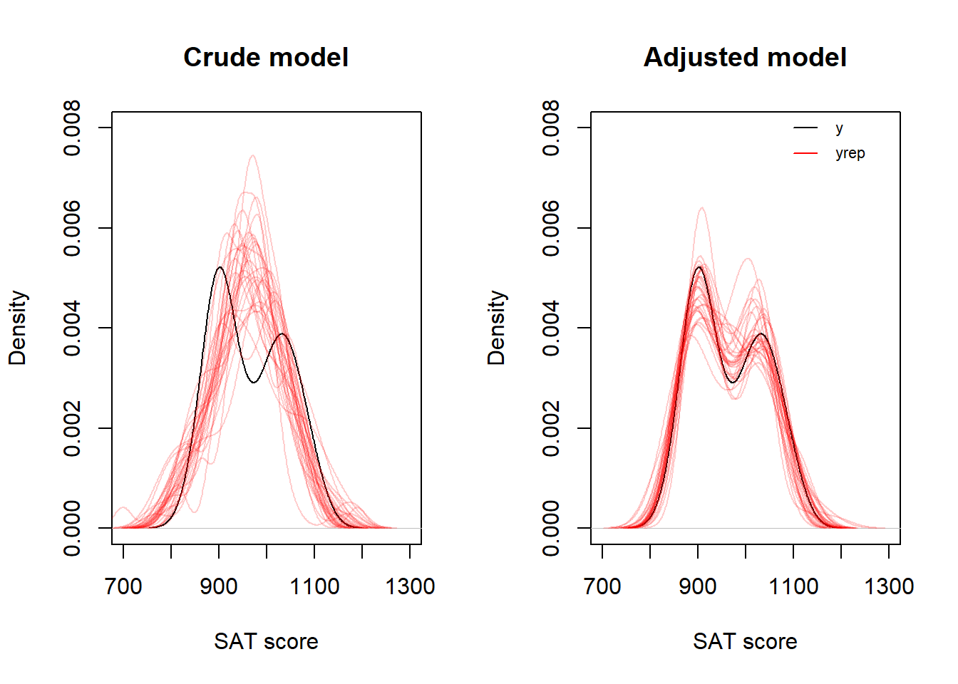 ylim = c(0, 0.008), main = "Adjusted model", xlab = "SAT score")