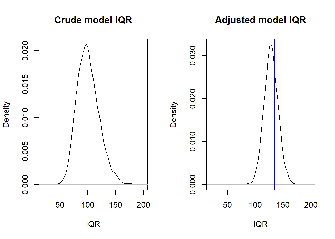 plot(density(iqr2), main = "Adjusted model IQR", xlim = c(20, 200), xlab = "IQR")
