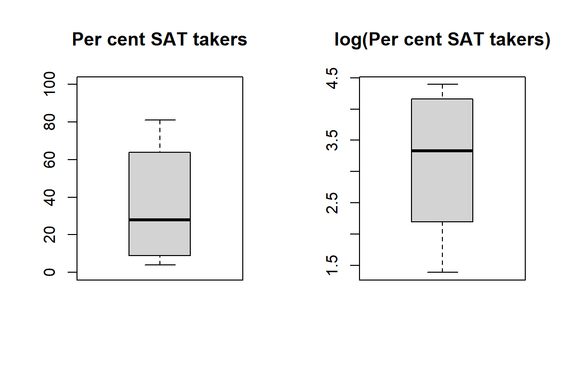 Boxplot of percentage (left) and log percentage (right) of students in the state taking the SAT.