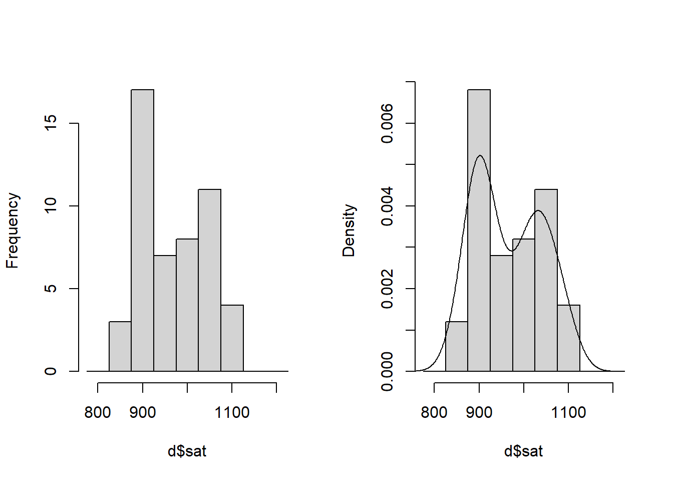hist(d$sat, breaks = seq(775, 1225, 50), freq = TRUE,