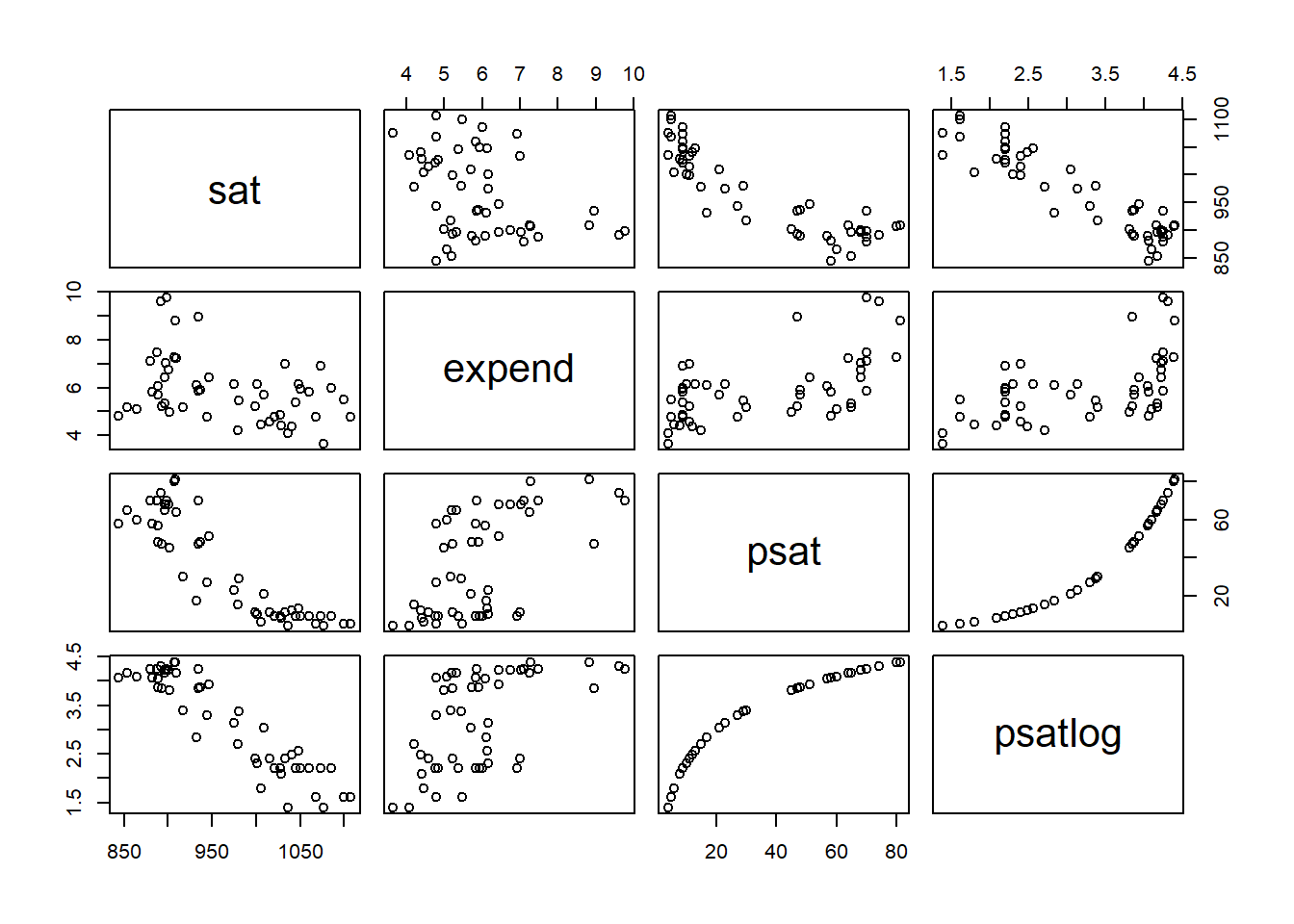 pairs(~ sat + expend + psat + psatlog, data = d)