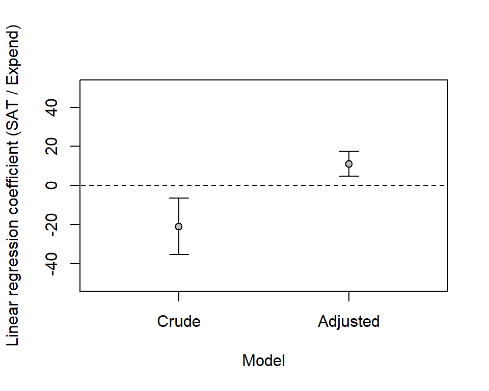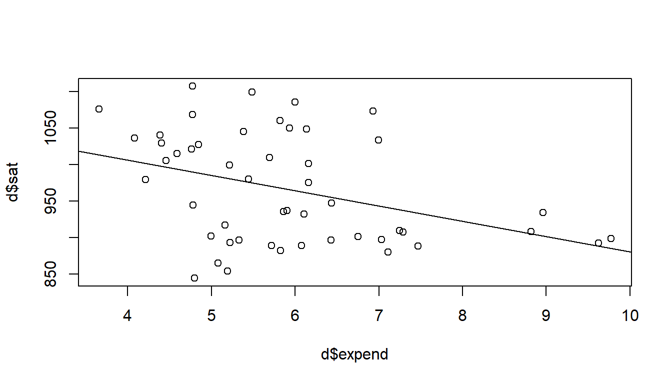 crude <- glm(sat ~ expend, data = d) # Simple (crude) regression model of SAT