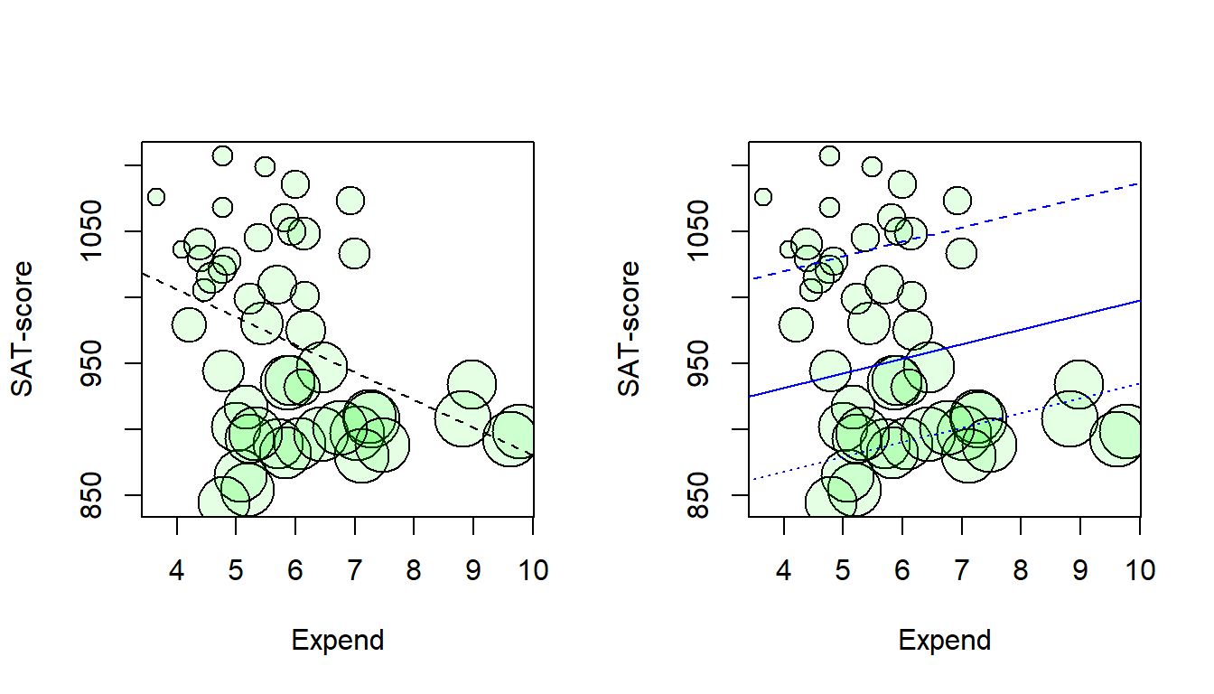 Scatterplot with symbol size related to percentage SAT-takers (psat). Lines from crude model (left) and from the adjusted model (right) for states with psat at the 25th (dashed line), 50th (solid line) and the 75th (dotted line) percentile respectively.