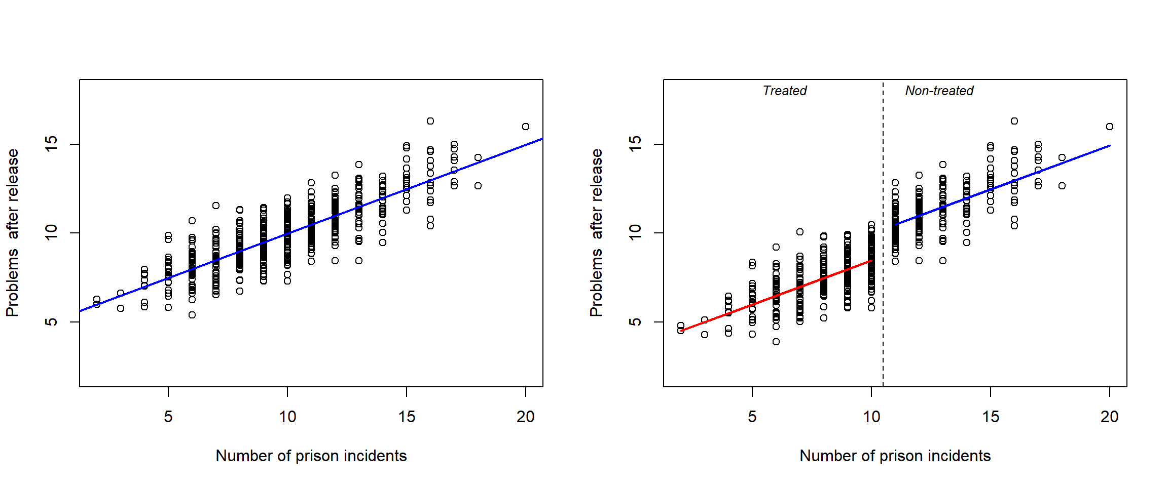Open symbols and black regression line refer to the full population; blue points and blue regression line refer to a sample restricted to high income people.