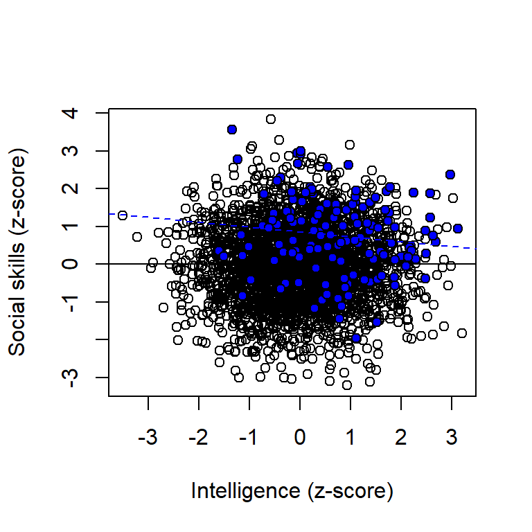 Assume that intelligence is independent of social skills in the general population, and that both have a positive influence on income. Assume we found a negative association between IQ scores and scores on a social skill test in a sample of chief executive officers (CEOs) of large companies. A causal interpretation of this could be that: “Maybe people with high IQ spend a lot of time reading books, and therefore do not develop their social skills.” An alternative explanation would be that the observed association was spurious, an example of collider bias. Here a simulation: