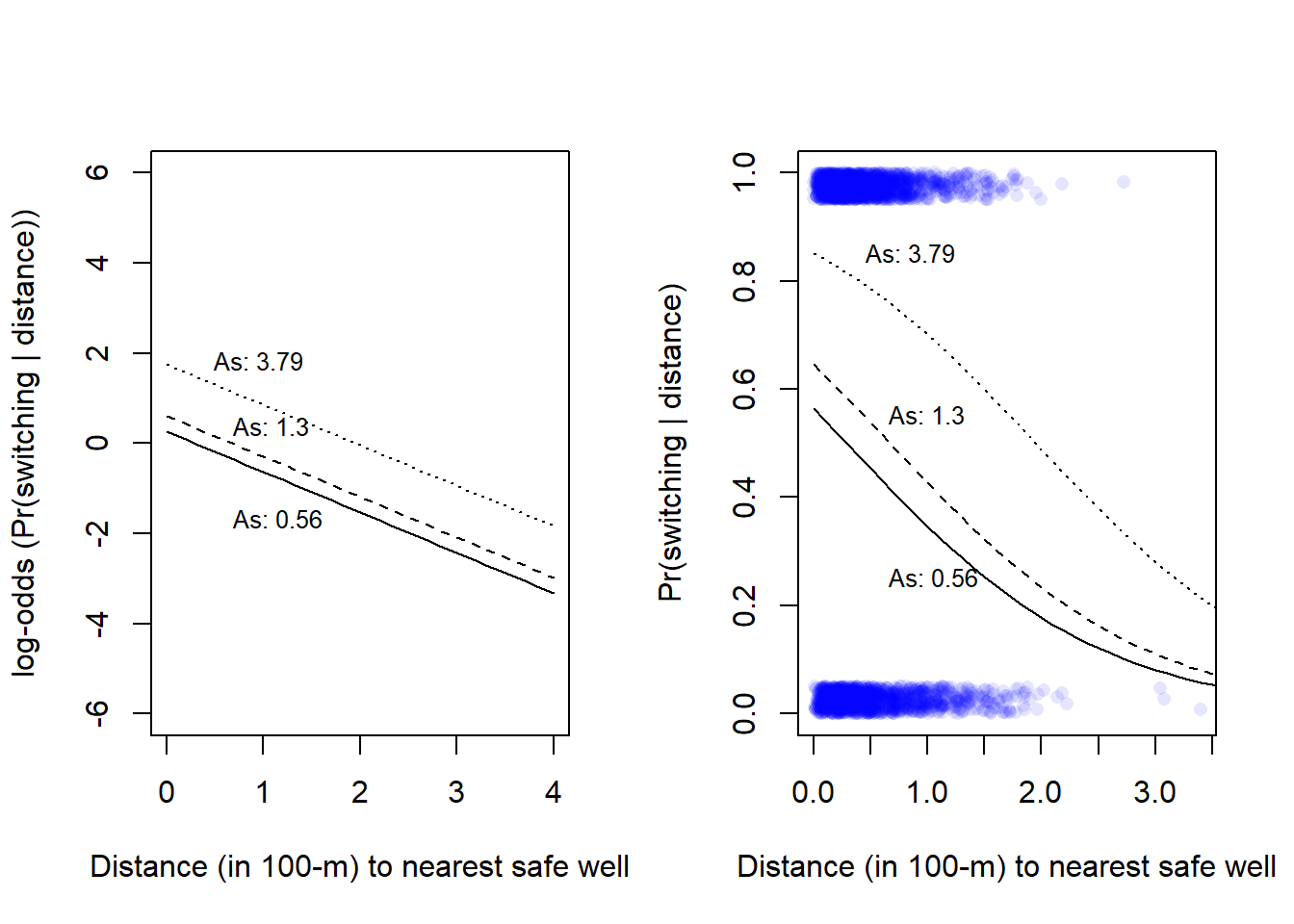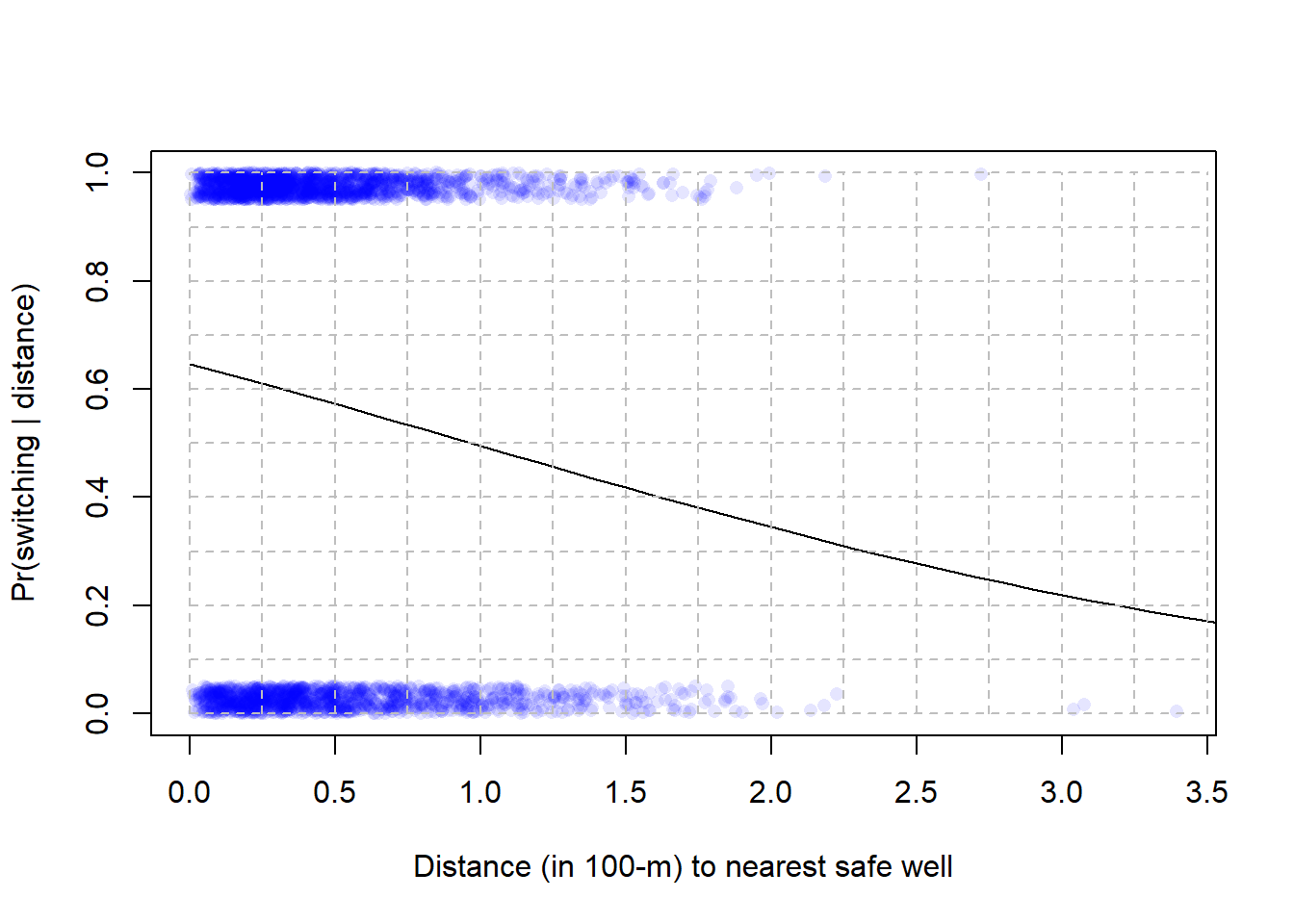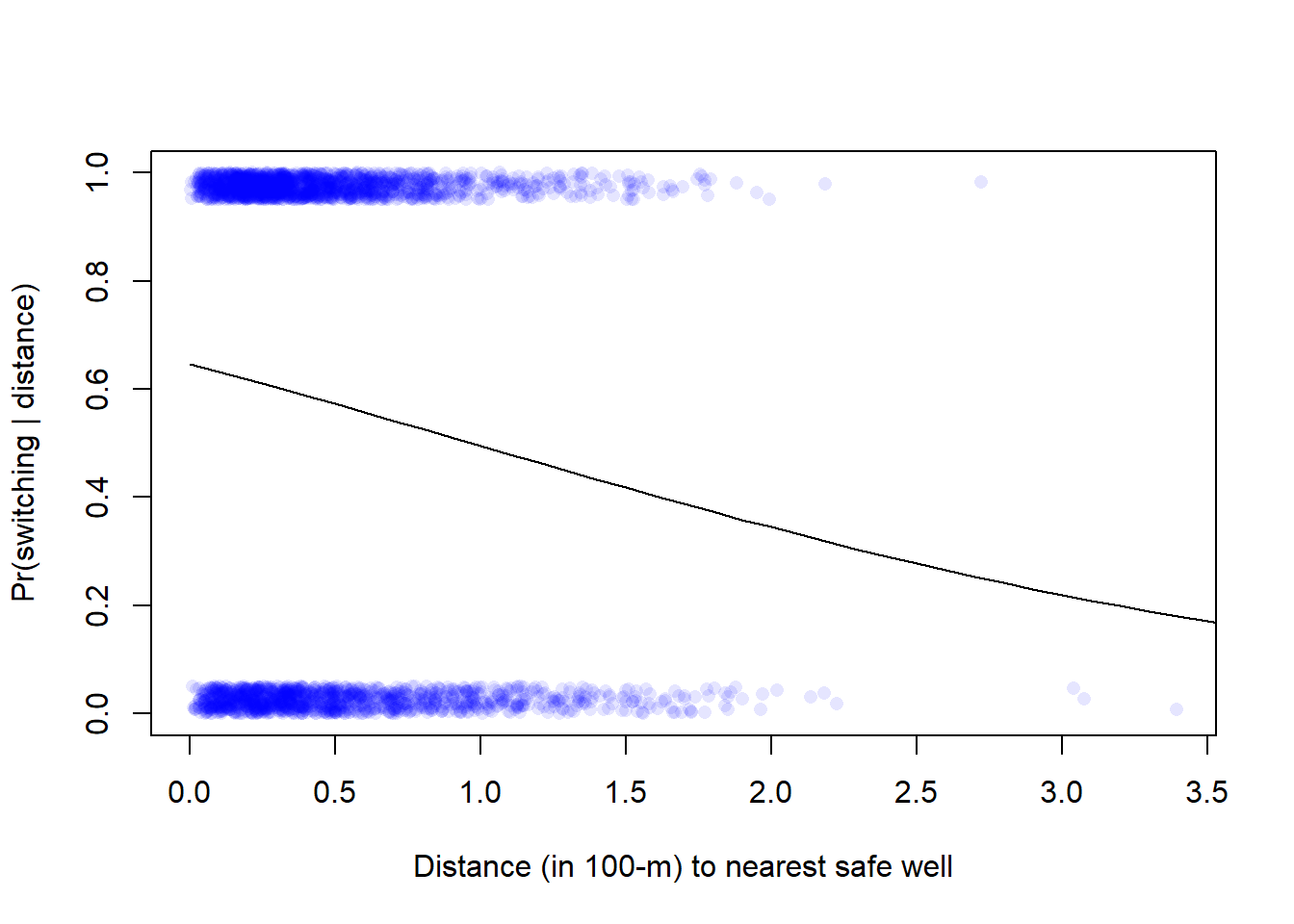Estimate by eye the predicted difference in probability of switching wells between people living 200 m compared to 0 m (next to) the nearest safe well.
