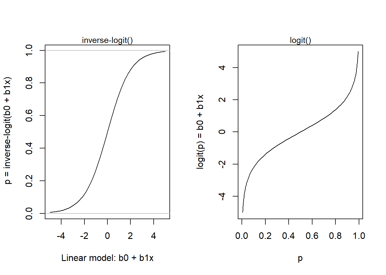 As seen in the left-hand figure below, when the output of the linear model (\(b_0 + b_1x_i\)) goes below -4 or above +4, the predicted probability (the output of the inverse-logit) is close to zero and one, respectively. When the linear model is zero, the probability is 0.5.