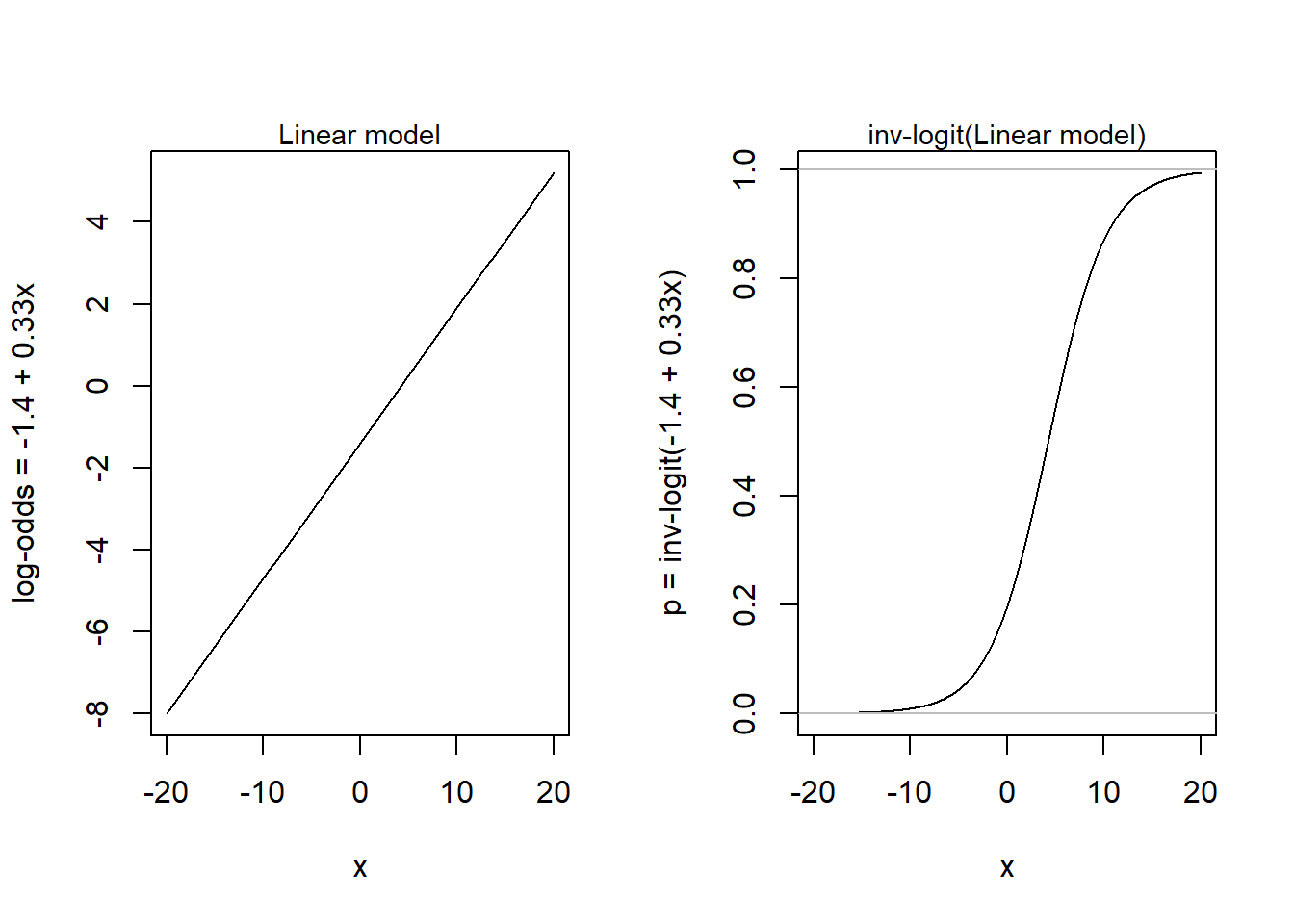 The linear model is nested in the inverse logit, \(logit^{-1}\), that restricts the output of \(p\) to the interval [0, 1]: