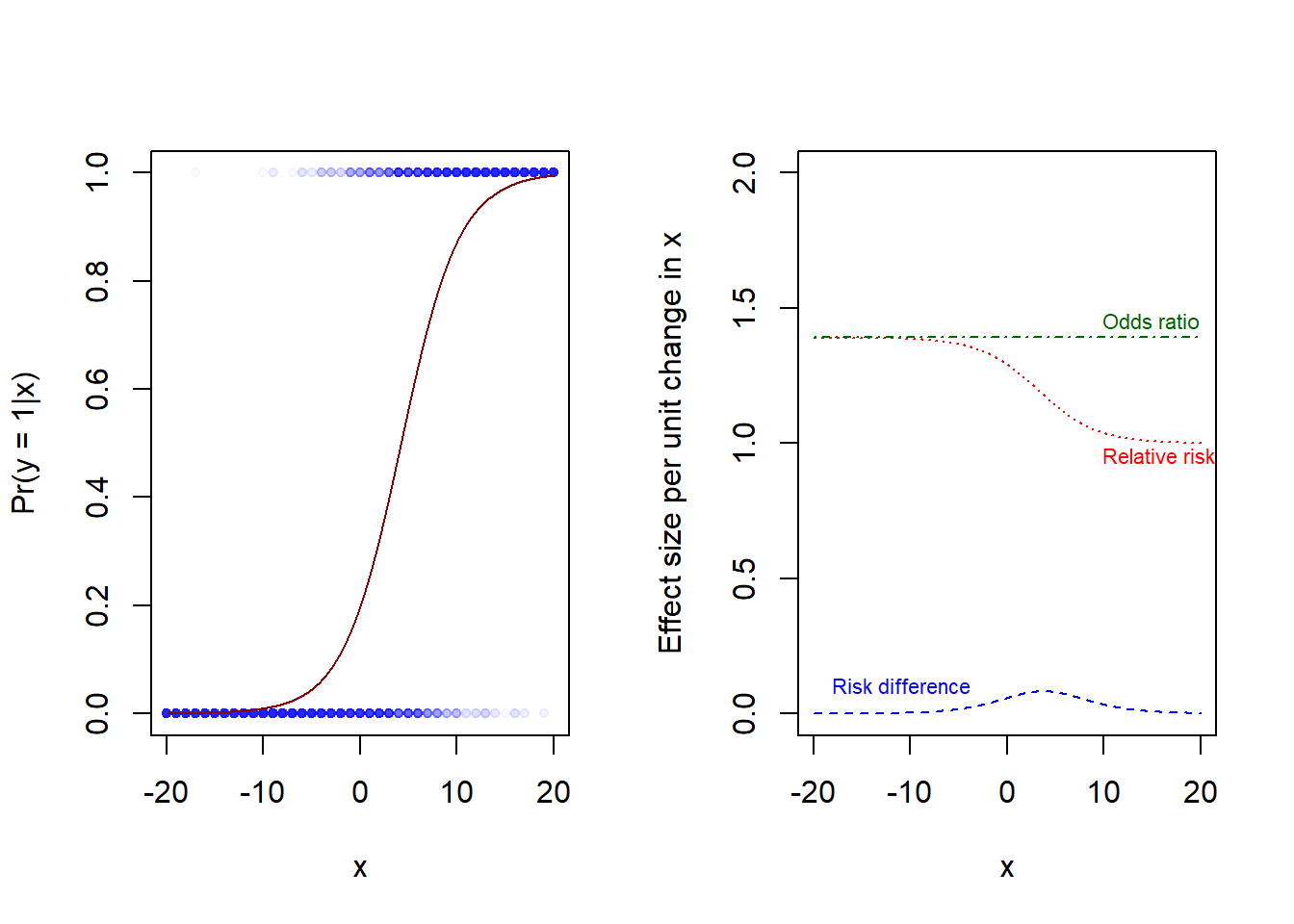 In their example, the function predicted the probability of supporting George Bush in the 1992 presidential election, as a function of income level from 1 to 5 (see their figure 13.2). But here I will assume another story, to justify looking at the function in its full range. So, let’s assume that y is a binary outcome variable indicating success (1) or failure (0) in solving a not too-easy mathematical problem, and x is a mean-centered variable representing the amount of mathematical training of the problem solver (-20 is the amount of training of a 7-year old school kid, +20 of a Ph.D. in mathematics, and 0 is the mean amount of training in the population).